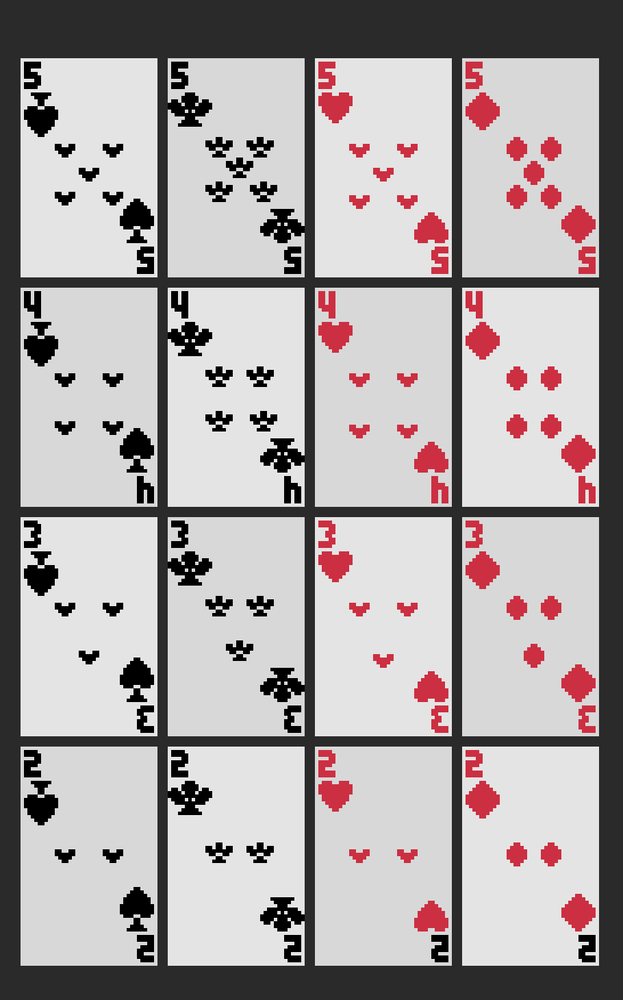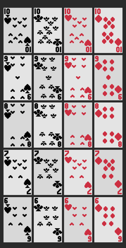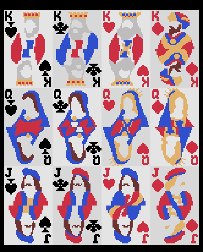 A pack of 54 french playing pixel cards and 2 card back. You can download and use them as you wish for free. If you like the card set, you can donate any amount you deem appropriate