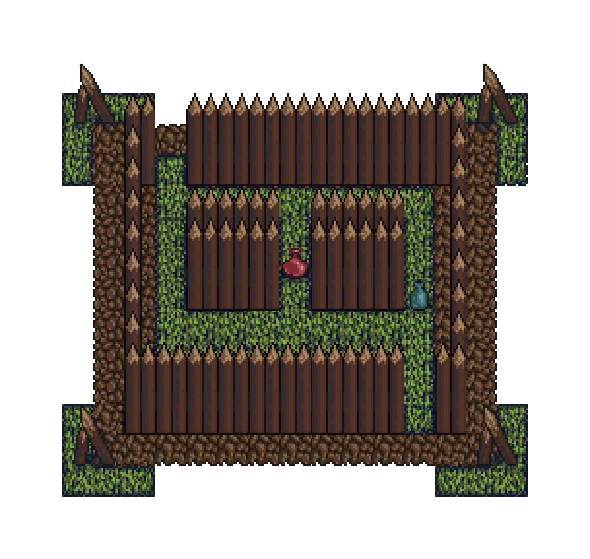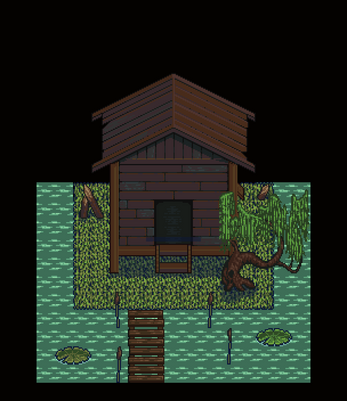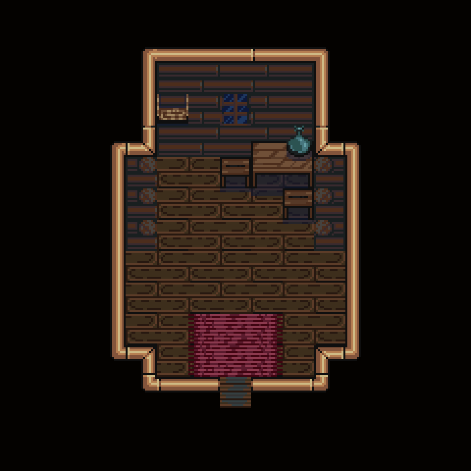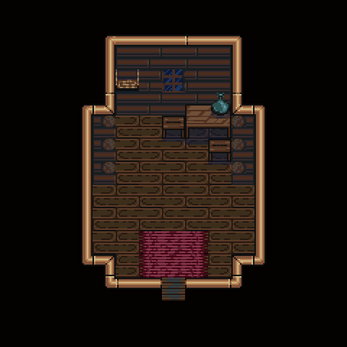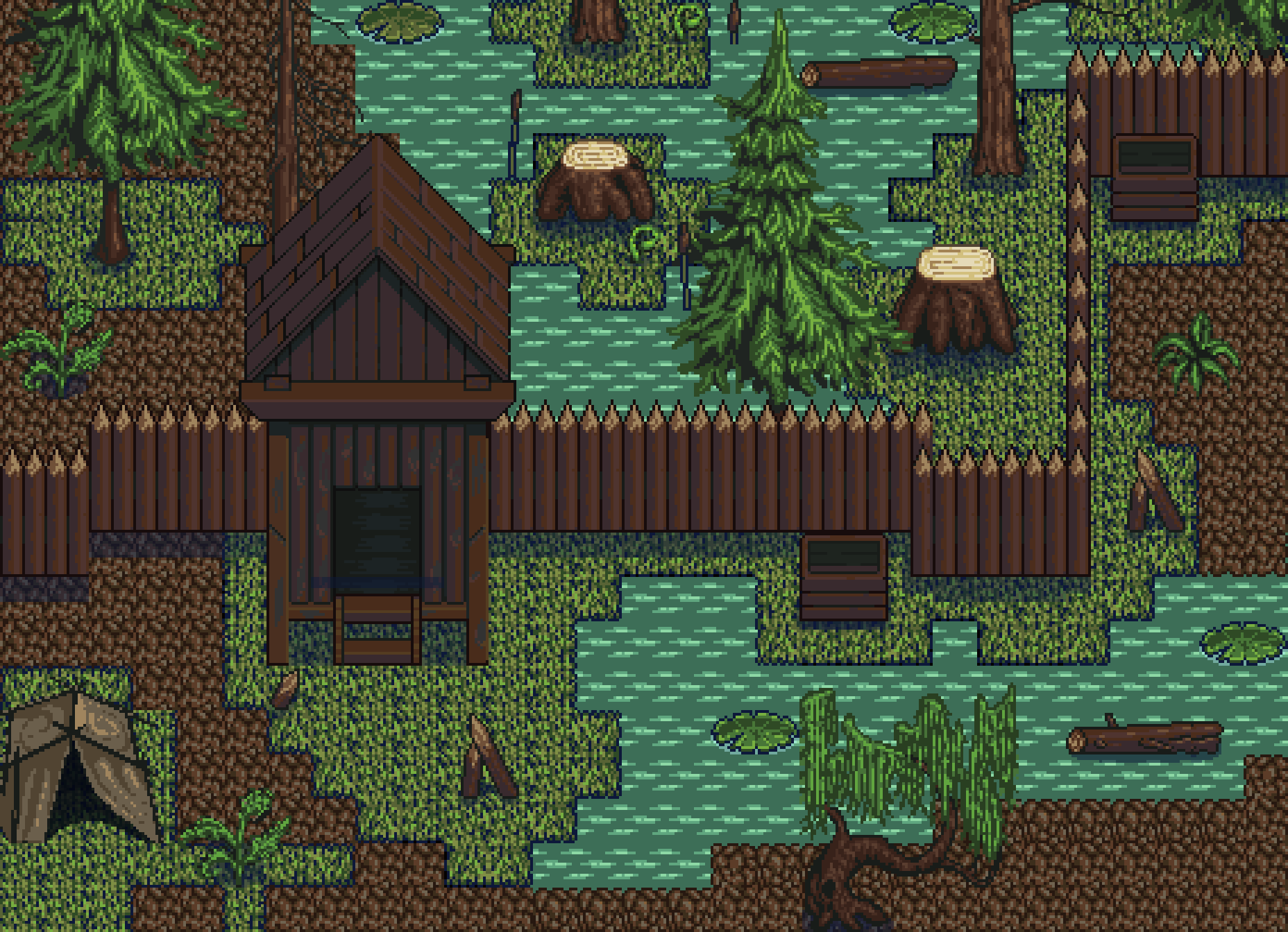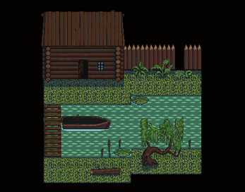 Hello! This is my new tileset. It contains 3 houses on the outside, interiors on the inside, tiles for grass, ground, and animated water, 8 trees, a fence, and some other environment elements.